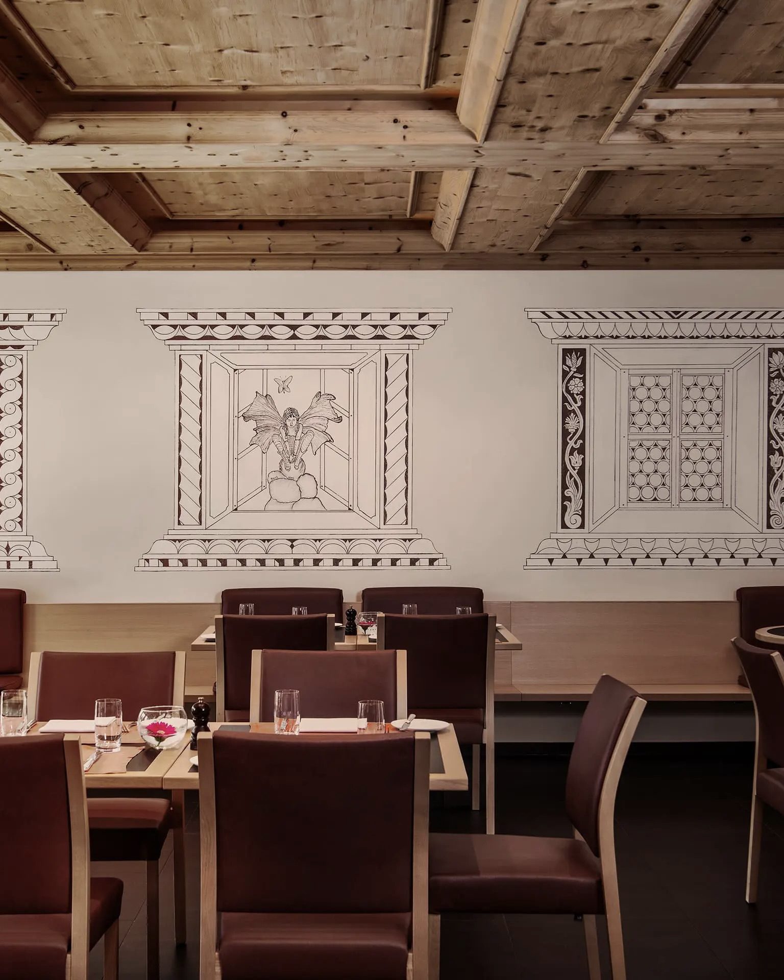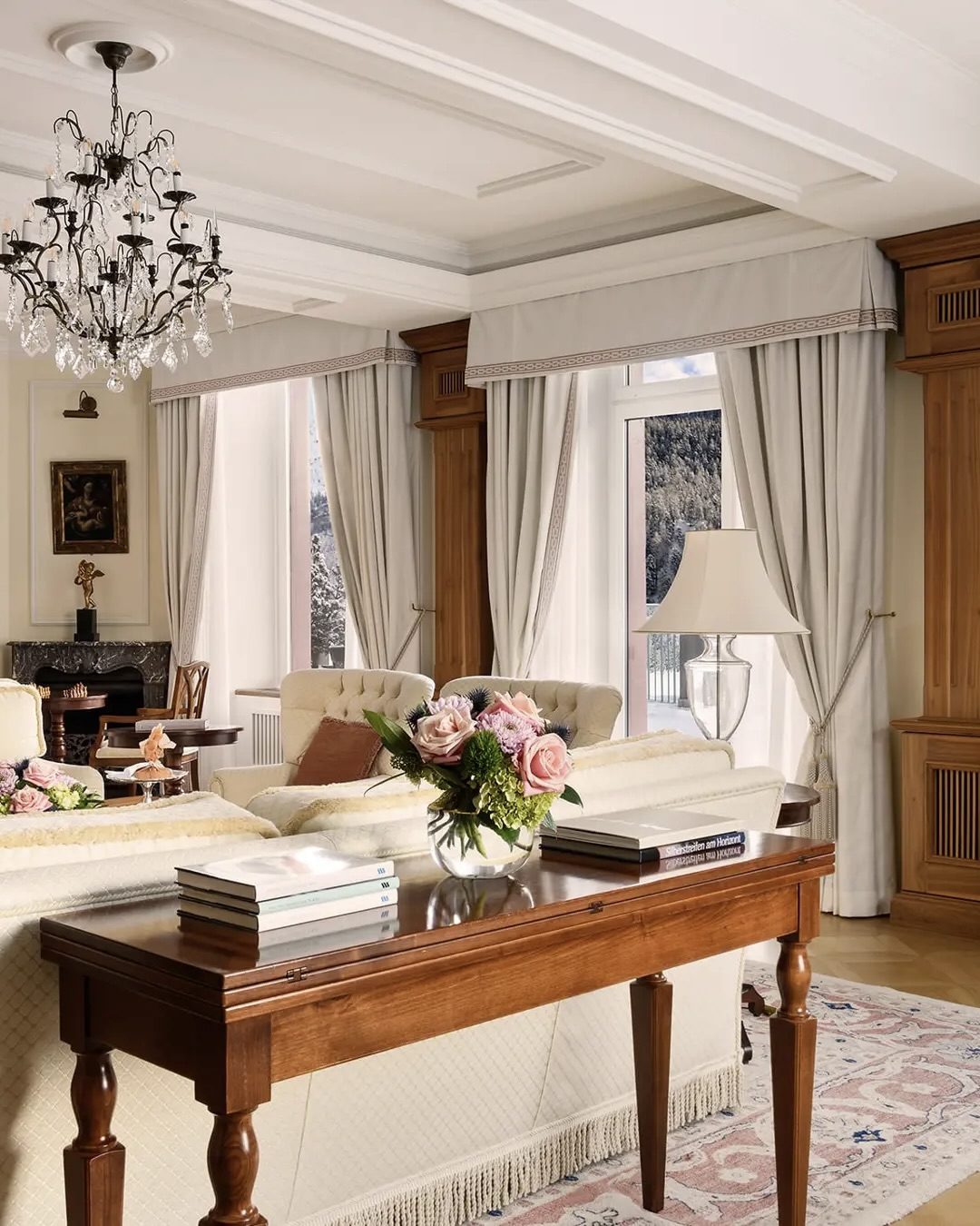 Inside, design details reflect the hotel’s balance of heritage and renewal. Soft lighting, marble bathrooms, and layered textures create an atmosphere of warmth and calm, ideal after a day on the slopes. During the winter season, subtle touches – pine greenery, candlelight, and seasonal florals – enhance the sense of quiet luxury without ever feeling overdone.