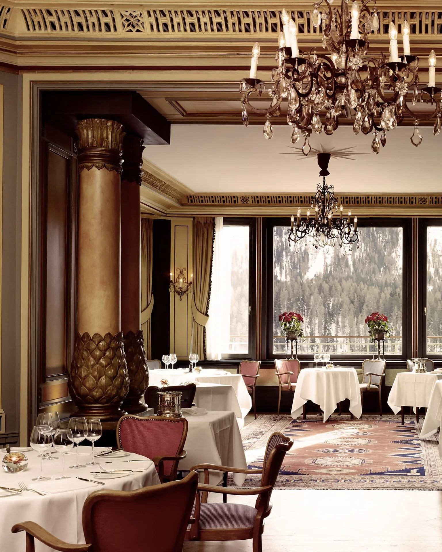 A stay at Badrutt’s Palace is as much about atmosphere as activity. Mornings are spent skiing the Corviglia slopes or cross-country trails; afternoons might lead to the Palace Wellness Spa, where the heated indoor-outdoor pool faces the snow-covered peaks. The spa’s serene design and mountain views make it one of the most remarkable wellness settings in the Alps.