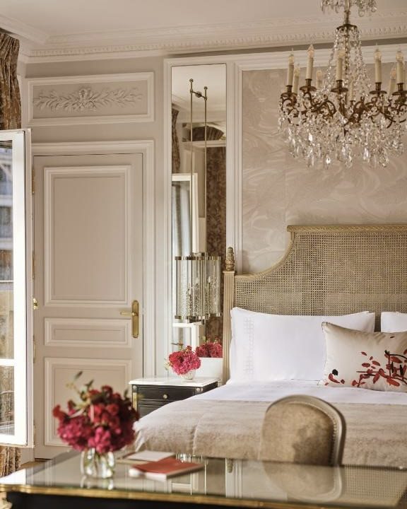 Rooms and suites are dressed in rich fabrics and soft lighting, creating an atmosphere made for slow mornings and quiet evenings. Dining is intimate and polished, while terraces and balconies frame postcard-perfect Paris views. The hotel’s fairytale quality lies in its ability to make every moment feel considered, graceful, and deeply personal.