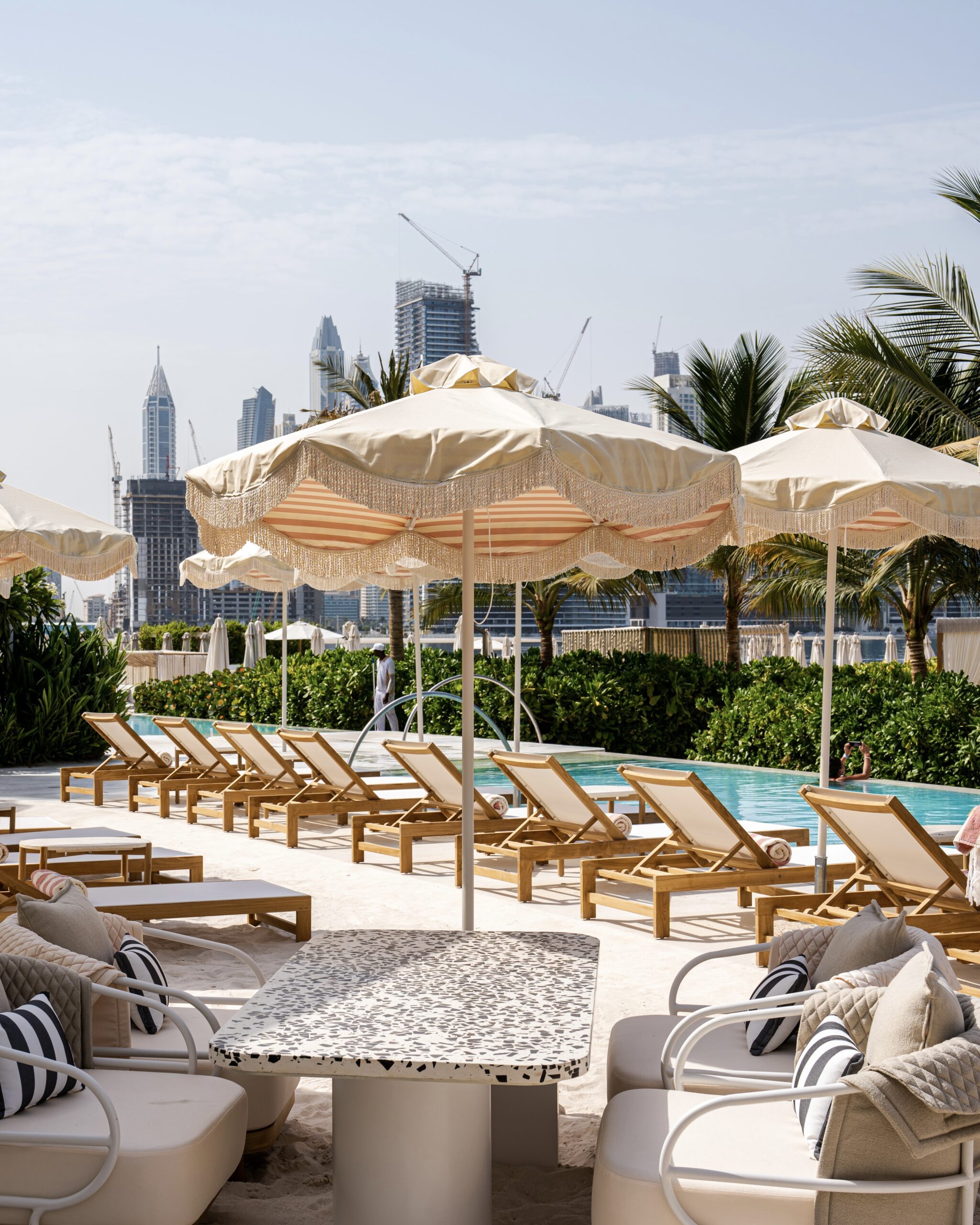 Still standing as a firm favourite, SAL. Located at the iconic Burj Al Arab, this ultra-luxurious beach club experience offers Mediterranean-inspired elegance. The design is a sophisticated blend of crisp whites and soft neutrals, complemented by a stunning infinity pool and plush sunbeds overlooking the Arabian Gulf. With views of Dubai’s most famous landmark and an ambiance that’s both serene and exclusive, SAL is perfect for those seeking a high-end, tranquil day by the sea. The refined aesthetic and attentive service make it a top choice for guests who appreciate the finer details.