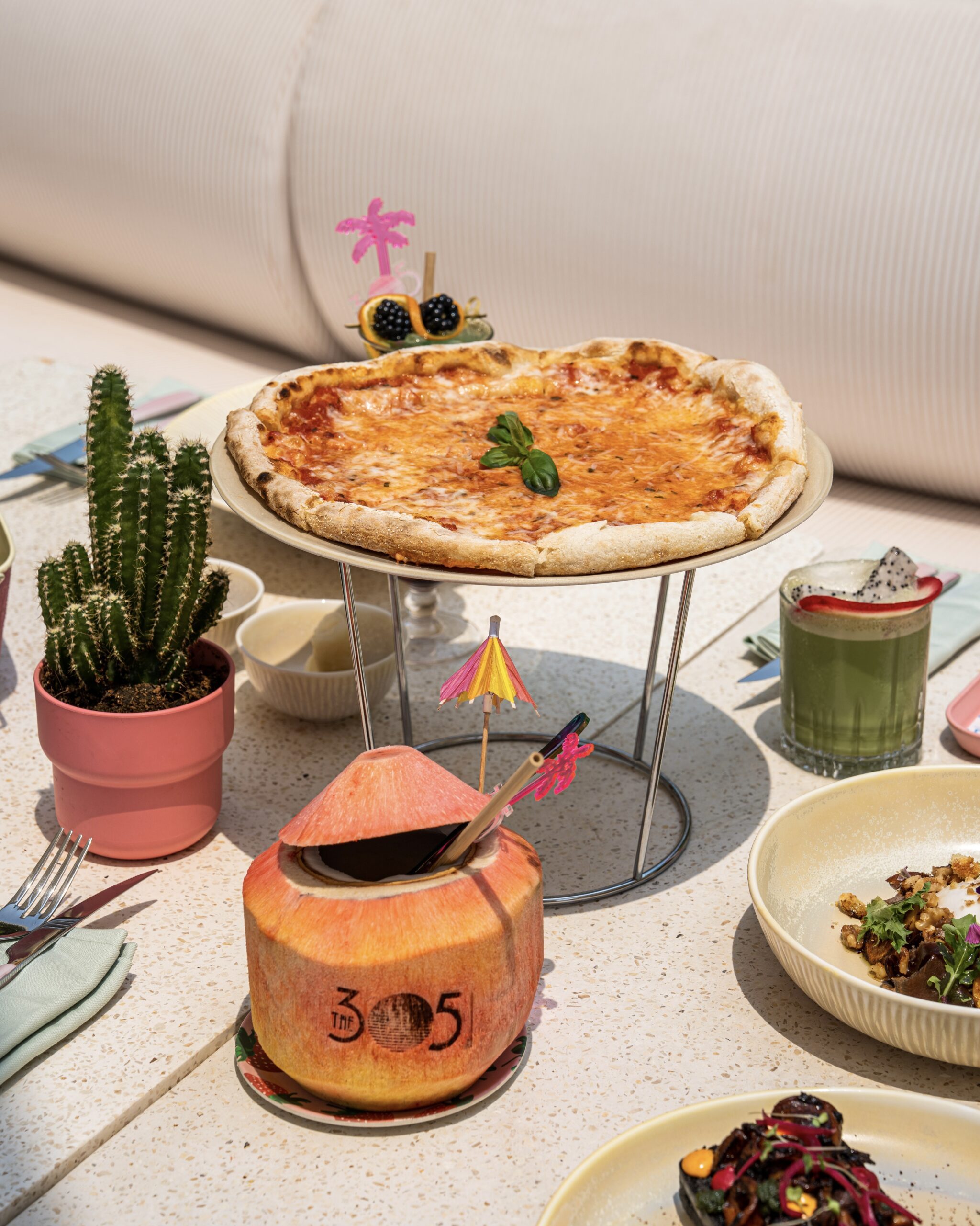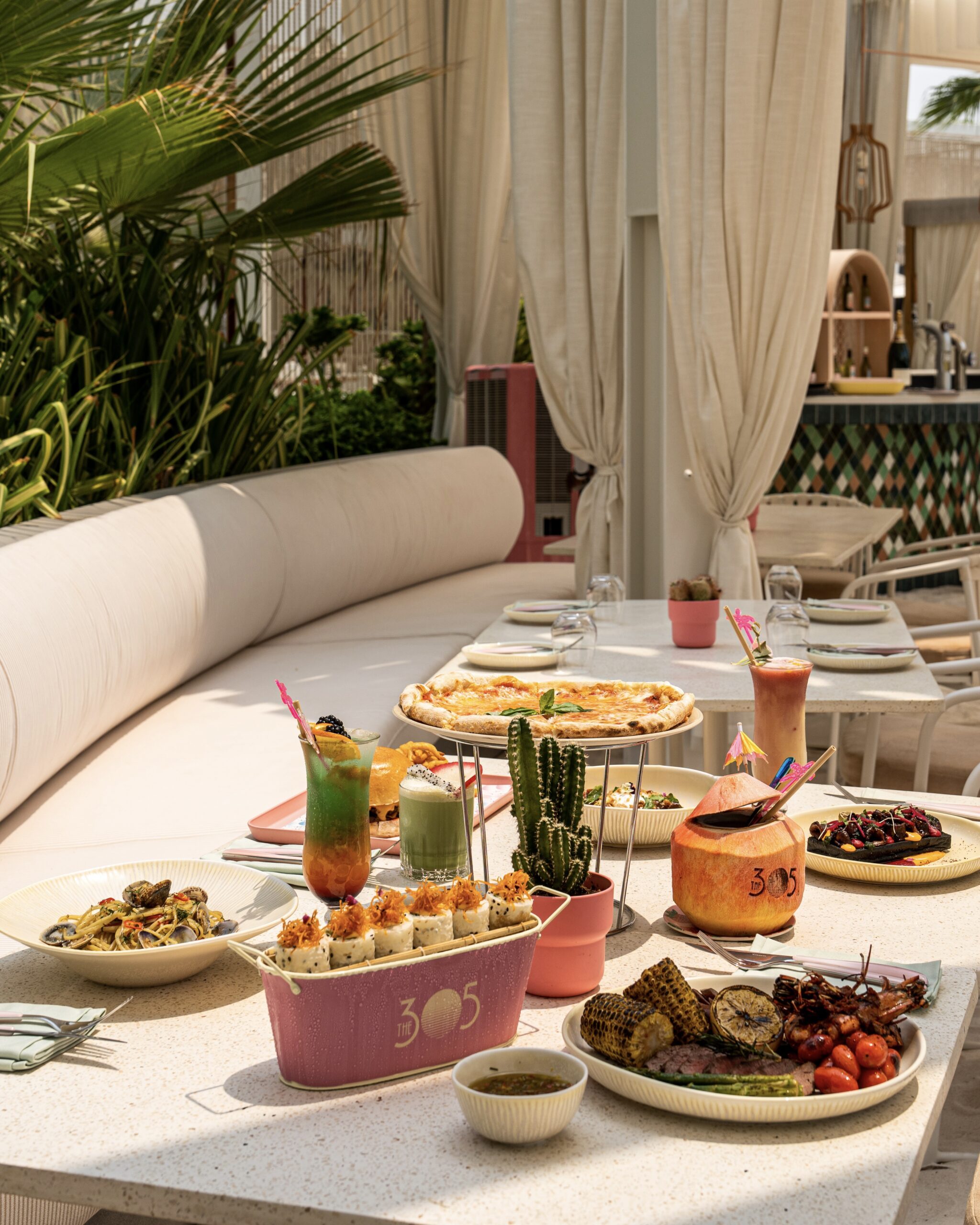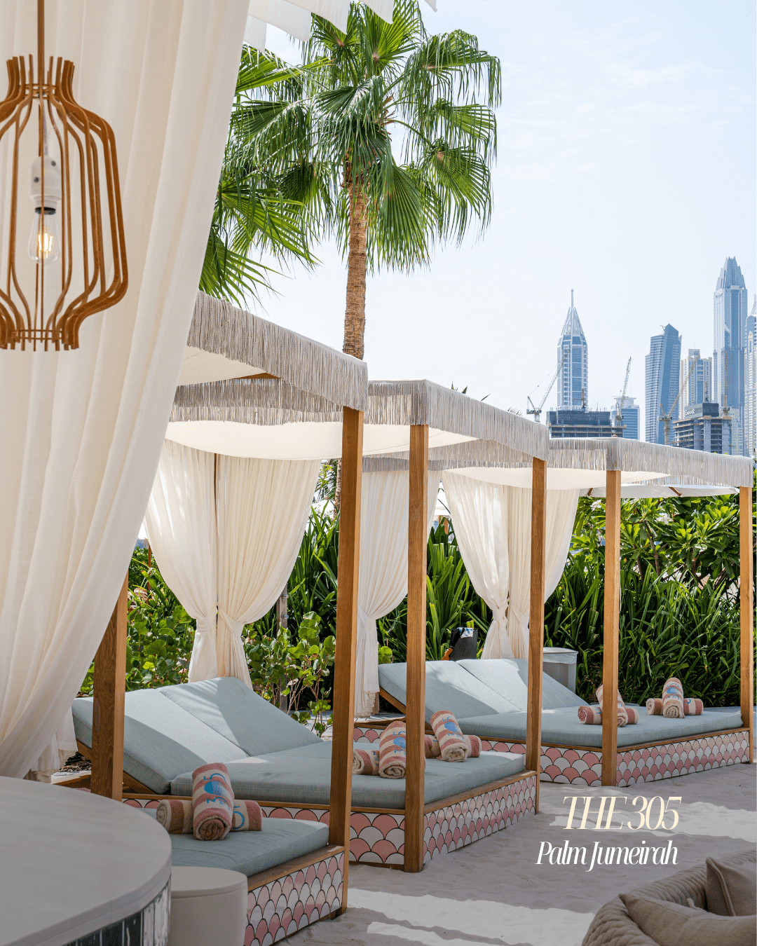 Located on Palm Jumeirah’s West Beach at The Club, The 305 channels Miami confidence – think bold colours, fun interiors and *. Daybeds and cabanas frame a sleek pool that runs toward the water, with the Marina skyline in clear view. The setup is built for a social crowd: seamless beach access, proper shade, quick service, and an upbeat playlist perfect for all-day lounging.