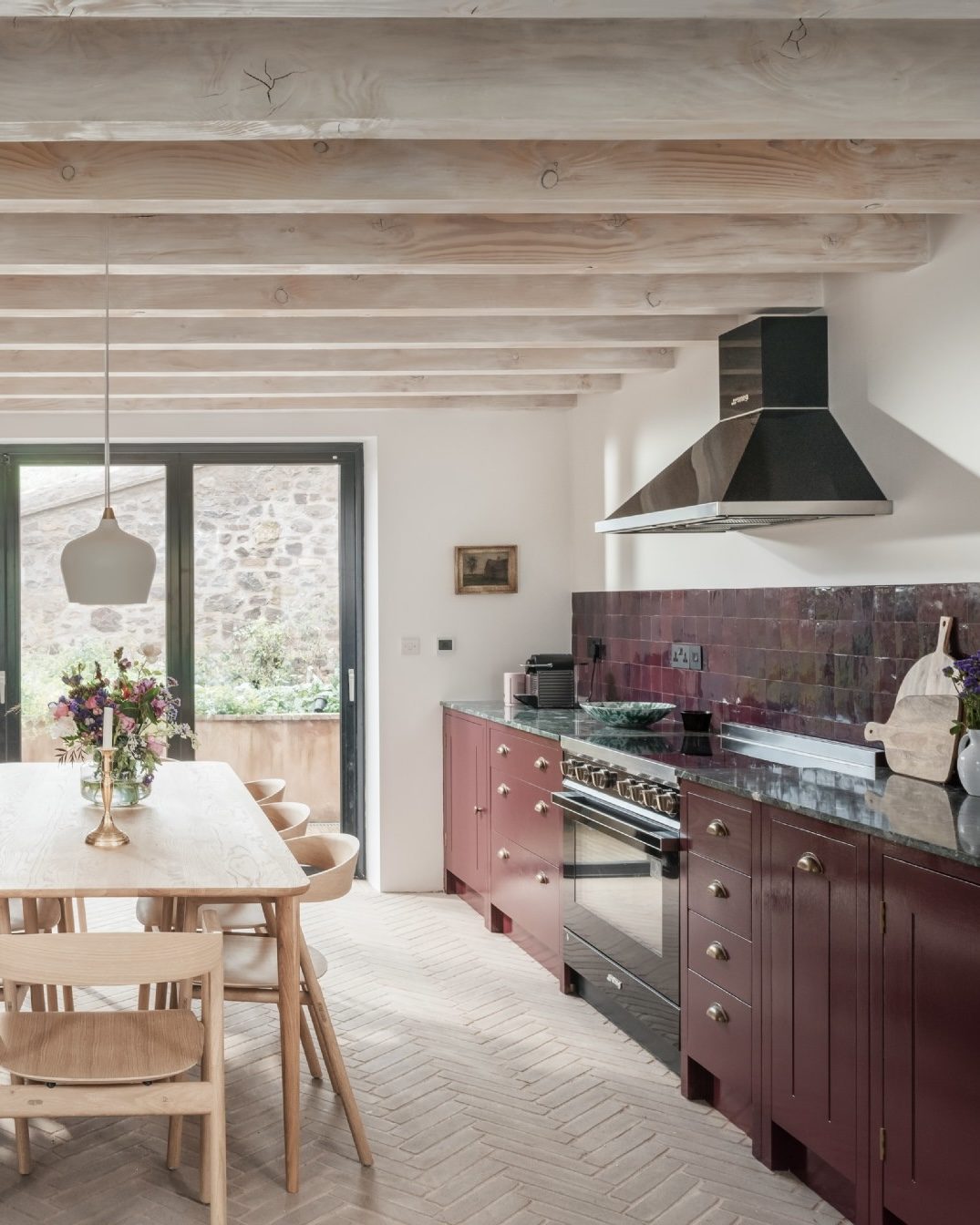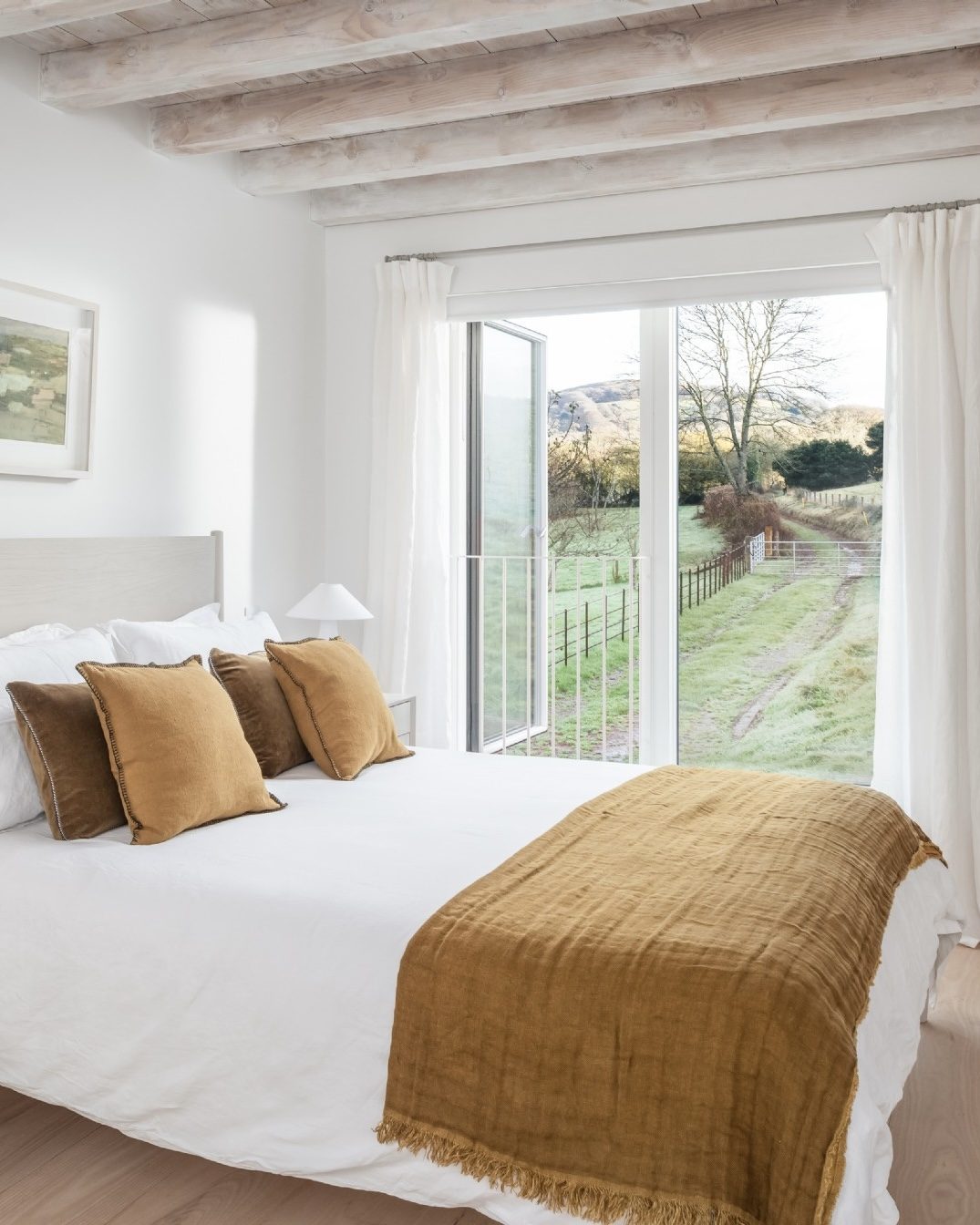 Aria sits within fifty acres of quiet Somerset countryside near the village of Crowcombe. Built from zinc, concrete and glass, it’s a modern home that feels calm and grounded in its rural setting. Designed to sleep six, the house has been created for easy family living, with an open-plan kitchen, dining and sitting area at its heart. The large sofas, soft textures and natural materials make it a welcoming place to gather after days spent exploring the hills. A fig-pink kitchen opens to the courtyard, and the ground floor bedroom offers simple comfort beside the garden. Upstairs, two further king bedrooms and a small workspace look out over the fields, each designed with a quiet, uncluttered feel.
